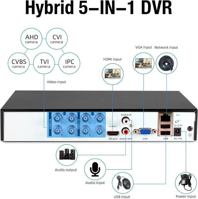 8-channel High CapacityOur 8 channel dvr can connect up to 8 surveillance cameras at the same time, and supports AHD/TVI/CVI/CVBS/IP camera 5-in-1 access mode.This large-capacity design allows you to flexibly layout the camera and fully control each monitoring point, whether it is a large shopping mall, warehouse, factory workshop, or complex environment such as multi-storey residential, school campus, can achieve a full range of monitoring without dead corners.