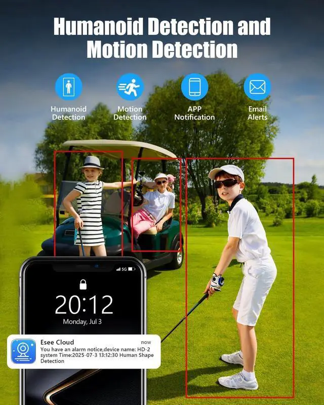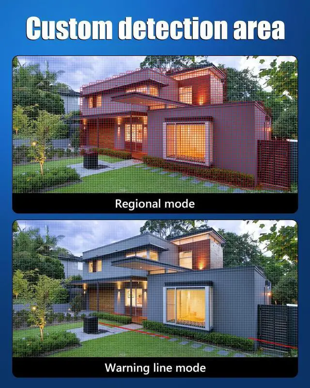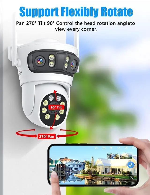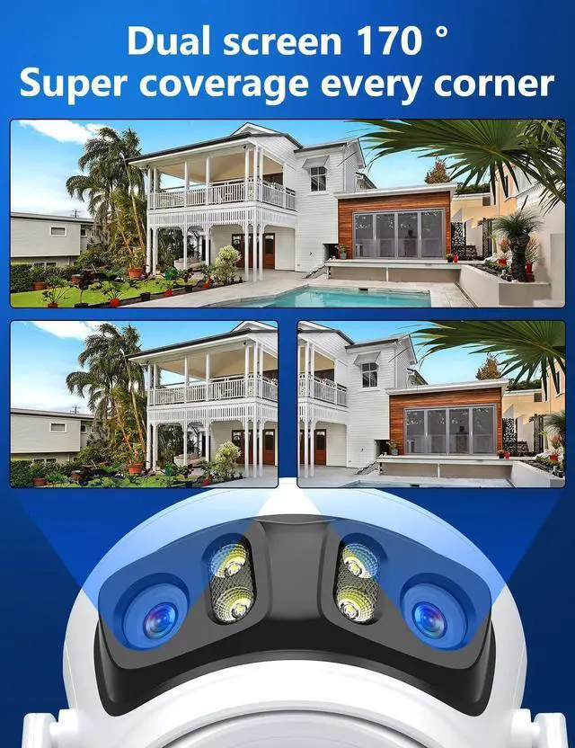 6MP HD Night Vison & AI Human Detection & Auto CruiseOur triple lens wireless security camera equipped with 10 flood lights and 6 IR lights provides 6MP Ultra HD video with three night vision modes (full-color/infrared/smart vision) that you can switch between freely, built-in AI algorithm triggered by human movement, which can realize human detection, automatic cruise and intelligent alarm function, allowing you to spot any suspicious activity in time.