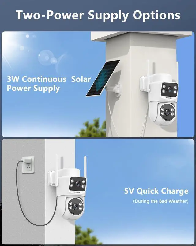 {100% Wire-Free & Solar Powered } This solar security camera installs anywhere outdoors with no power cords or Ethernet cables. Its built-in 3W solar panel battery deliver year-round operation, while the 12V/1A port provides backup power when needed. (It needs to be plugged in and charged for 5-6 hours before first use) {2-Way Audio, Siren & Flashlight Alerts} This surveillance & security cameras feature a built-in microphone and powerful speaker, so you can have clear, remote conversations with visitors or intruders. If the wireless camera detects an intruder, it will sound an alarm with flashing lights and immediately send an alert notification to your phone. {2.5K Color Night Vision} Built-in 8 white light and IR LEDs, this outdoor camera wireless offers three night vision modes (Full Color/IR/Smart Mode) for optimal visibility. Its smart light sensor automatically adjusts to changing conditions, switching to color night vision when possible. With 10x zoom, 50ft long-range vision, enjoy crystal-clear video day or night. {AI Motion Detection & Auto Tracking} Featuring advanced AI human detection with 99% precision, this outside camera instantly distinguishes human from objects. Upon detecting movement, the tracking camera activates from standby and automatically follows human activity. Customize surveillance with up to 6 specific detection zones via the app. {2.4G/5G Hz WiFi & Fast Bluetooth Pairing} Achieve stable connection with dual-band WiFi-6 (2.4GHz for extended coverage + 5GHz for smoother HD streaming). Enjoy hassle-free setup via one-touch Bluetooth pairing no complicated router setup needed! Record 24/7 to an SD card (up to 256GB) or cloud storage, and remote review view anytime, anywhere. {Dual Lens, Dual Screen & 360° PTZ} Our home camera system combines a fixed panoramic lens for constant monitoring of key areas like your front door or garage, with an active tracking lens that rotates 355° horizontally and 90° vertically. Control the PTZ camera remotely via the app for near-360° blind-spot-free coverage. {Free APP No Month Fee} Download the free app "Honestview" from App Store on your smartphone. With an internet connection, you can watch the videos remotely from anywhere on your phone (IOS&Android), PCs, or tablet.
