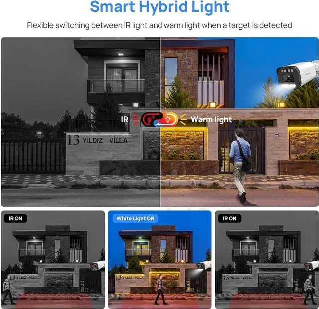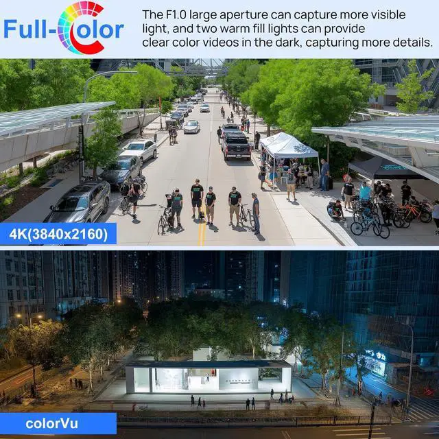 Smart Dual Light Full Color Night Security CameraThis 8mp poe camera outdoor equipped with intelligent dual lighting (built-in 4 warm lights and 4 infrared LEDs), it can provides colorful vision up to 98ft .Smart Dual Light technology adopts smart algorithm to detect targets. The IR illuminator is off at night when the target appears in the monitoring area, the white light is on, and the bullet surveillance camera records the full-color video and information of key events.