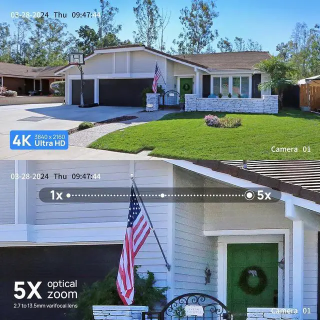 4K Super HD Resolution with 5X Optical ZoomThis 8mp poe ip camera is equipped with 1/2.8 inch progressive scan CMOS and 3840 x 2160@20fps resolution which providing super stunning image quality all day long.The bullet poe camera with 2.7-13.5mm 5x optical zoom lens, it can easily cover a larger monitoring area while maintaining high-definition image details, providing more precise protection for your security.
