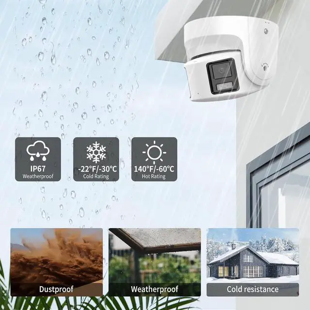IP67 Weatherproof & Active Intruder Deterrence: Features a weatherproof design resistant to dust and water, with built-in strobe light and audible alarm to proactively warn off intruders.