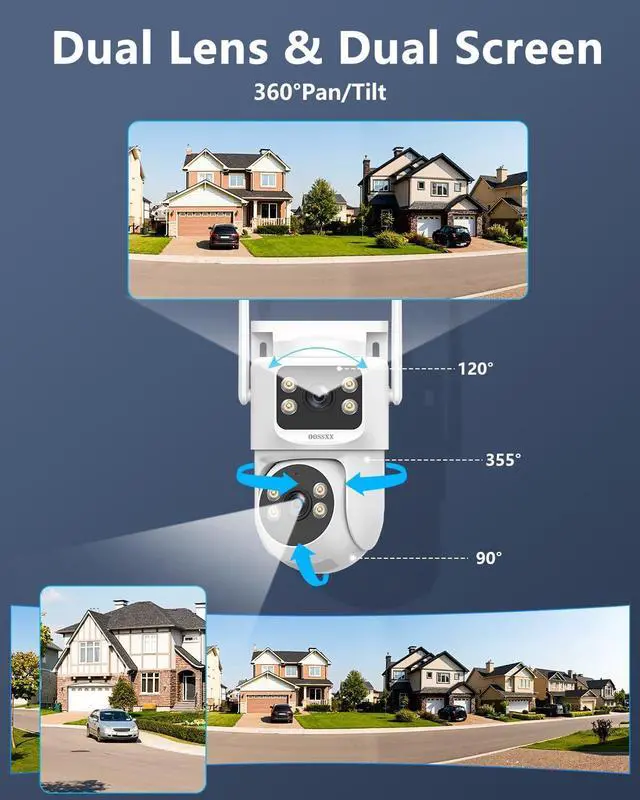 {Dual Lens, Dual Screen & 360° PTZ} Our home camera system combines a fixed panoramic lens for constant monitoring of key areas like your front door or garage, with an active tracking lens that rotates 355° horizontally and 90° vertically. Control the PTZ camera remotely via the