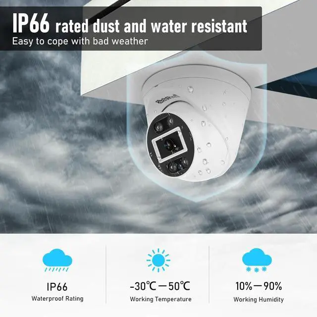 IP66 Weatherproof & Reliable StorageRugged design withstands rain, wind, and extreme weather. Supports cloud and SD card recording with auto-overwrite for uninterrupted monitoring. Perfect for homes, garages, yards, and commercial areas.