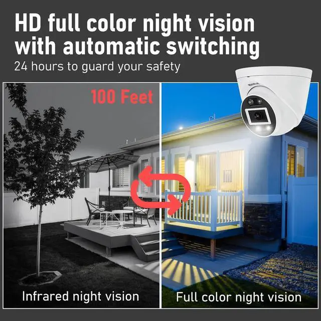 5MP Ultra HD Video & Color Night Vision Crystal-clear footage day & night. Smart white-light night vision reaches up to 100ft, keeping your home or business fully visible.