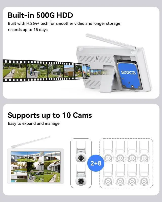 All-in-One 10 Inch Monitor NVR: This wireless security camera system comes with a built-in 10-inch HD display, so you can view live footage or recorded videos without needing an extra monitor. Ideal for homes or small offices without spare screens