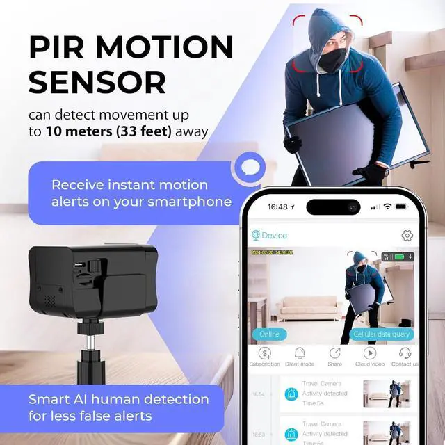 Smart Motion Detection with Instant AlertsUsing dual PIR sensors and smart person detection, this cameras that do not require wifi detect heat changes from people or animals. It records events and sends real-time alerts to your phone, making it ideal for home security and tracking activity anywhere.