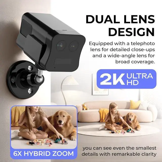Dual-Lens 4G LTE Cellular Security CameraEnhance security with a 4G LTE cellular camera featuring both a telephoto lens for detailed close-ups and a wide-angle lens for full coverage. No Wi-Fi is required, and the 6x hybrid zoom ensures fine details are captured, perfect for monitoring both large areas and specific points.
