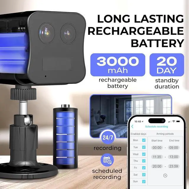 Three Recording Modes No WiFi Security CameraChoose from three recording modes: Motion Trigger Recording (saves battery/storage by recording only when motion is detected), 24/7 Continuous Recording (non-stop footage with auto overwriting), or Scheduled Motion Trigger Recording (records at specific times to conserve power and storage).