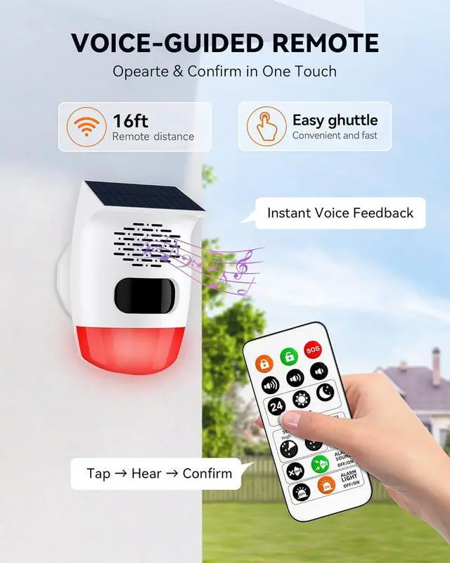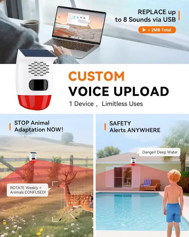 Custom Voice Upload Stops Animal Adaptation & Motion Activated Voice Player: Replace 8 bulit-in alarms (e.g., dog bark, gunshot) via USB (<2MB total). Rotate recordings to prevent wildlife habituation, or set safety alerts for pools/slopes
