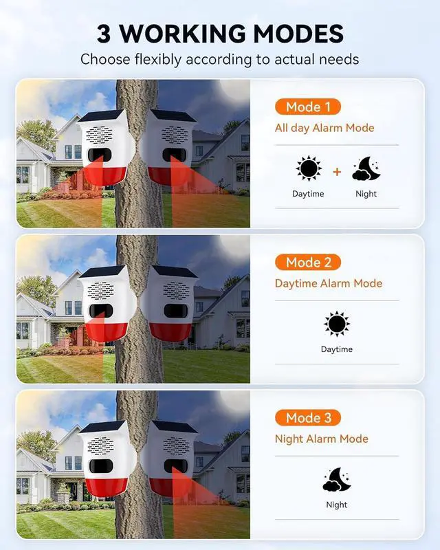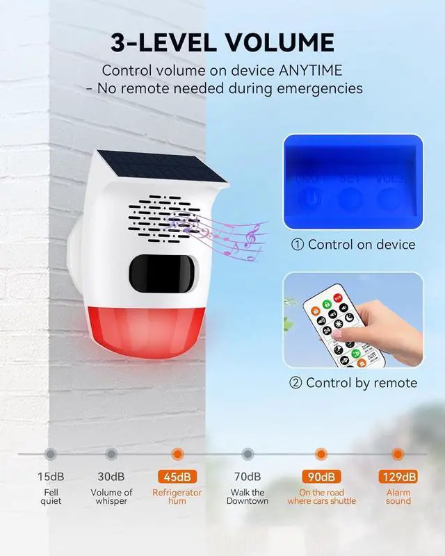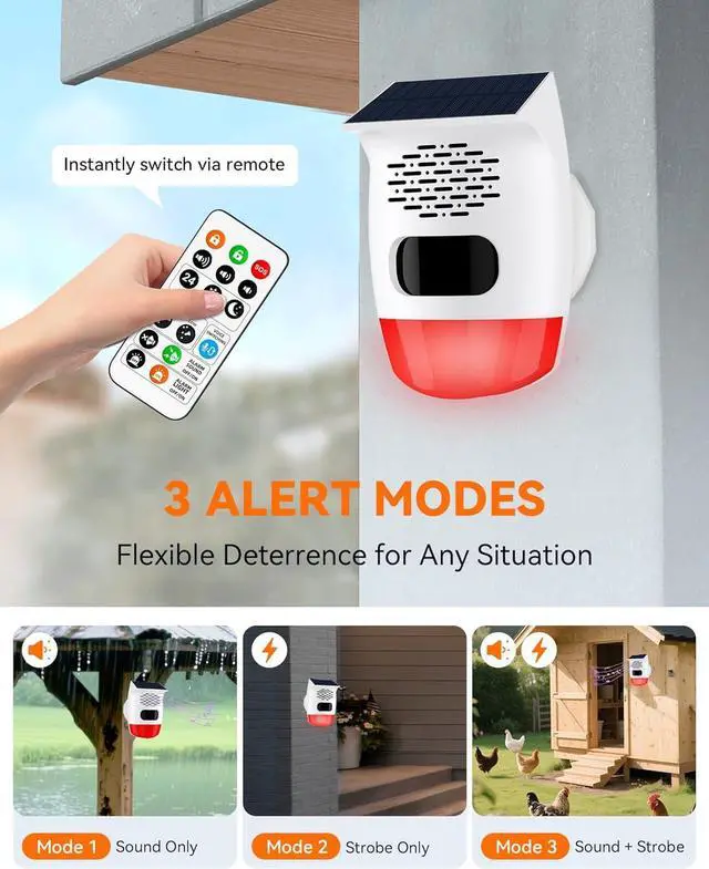 3 Adjustable Volumes + 3 Alert Modes for Any Scenario: Set 45dB /90dB /129dB (max) via remote or press buttons on device + choose strobe/sound/both alerts via remote for tailored protection effective for deer/bear deterrence and chicken coop protection