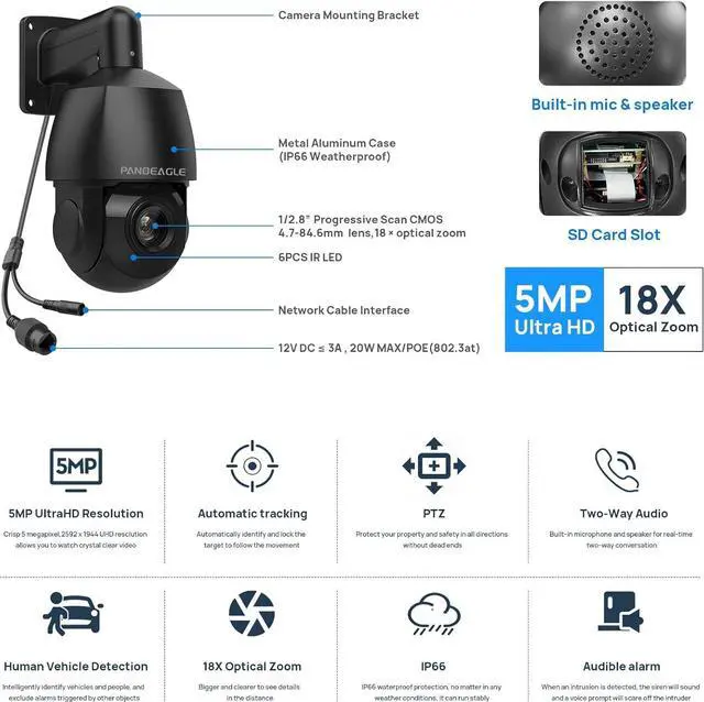PTZ IP Camera with 18x Optical ZoomThis 5mp outdoor ptz camera pan range: 0° to 360°, tilt range: 0° to 90°, powerful 18x optical zoom 4.7 mm-84.6 mm lens, easy to zoom And zoomed out to view distant objects without affecting the image quality, built-in 1/2.8Scan CMOS, 5MP (2592x1944) @30fps resolution is 3 times that of 1080p cameras. (User Manual attached in the bottom of the product's information. Please download in your needs.)