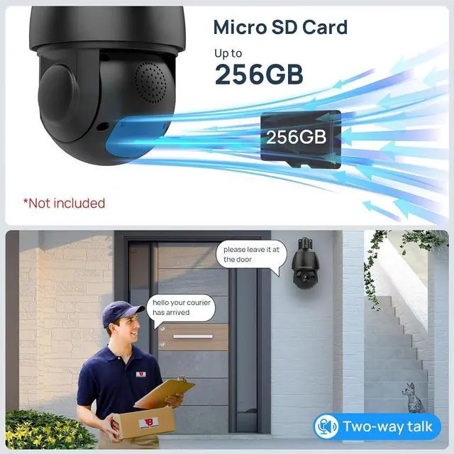 Upgrade Video Compression & CompatibleThis 5mp ptz security camera built-in sd card slot (up to 256GB), adopts the high 265+ coding standard and can record videos that are 4 times longer than H.264. It not only transmits clearer and smoother videos, but also saves 70% of disk storage space. Interoperability between cameras and other brands of NVRs can be guaranteed.