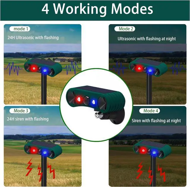 A variety of useful working modes: 4 working modes are optional: 24-hour ultrasonic + flash; ) Ultrasound + night flash; 24-hour siren + flash; Siren + night flash.