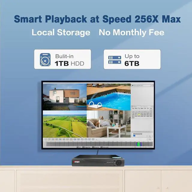 [1TB Hard Drive 24-7 Recording + Smart Playback Mode] 1.Various Record Modes: Regular 7/24/365 Human Face Detection 2.Playback Modes: IO Alarm Motion Alarm Regular Manual Key Video Analyse