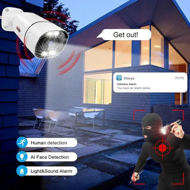 [AI Person/Face Detection & Instant Alerts] Smart PoE Security camera can accurately detect the movement/face of people within 10 meters. Motion Events Dual Warning: Instant alerts via email and notifications from FREE authorized applications, and sound & spotlight alarms (siren)