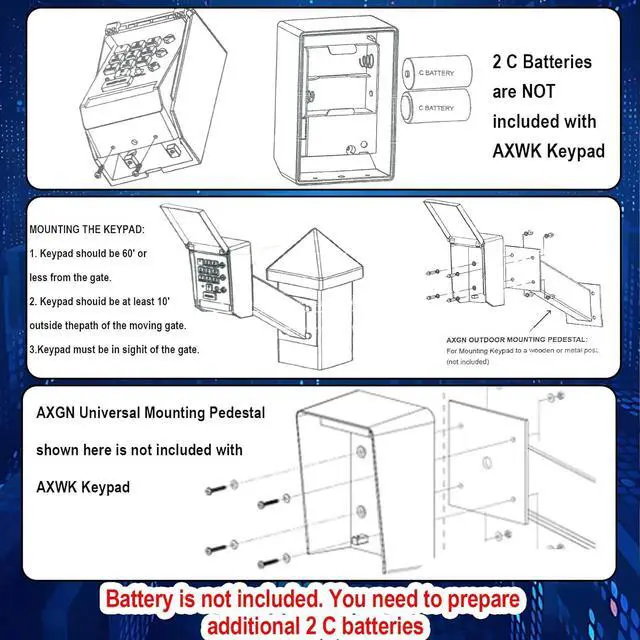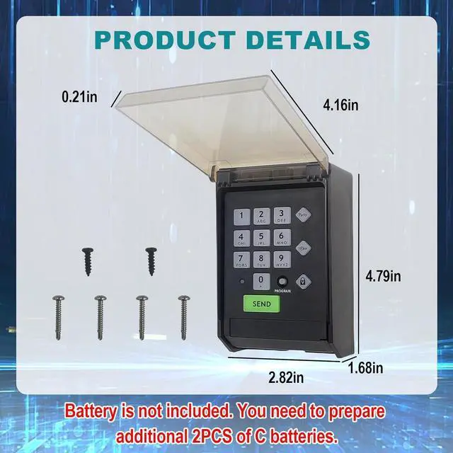 PACKAGE & SERVICE - This wireless gate opener keypad for ghost replacement comes WITHOUT batteries. It has a through user manual.If you have any further questions or problems during the programming process, you can contact us at any time, we will be the first time to provide you with help