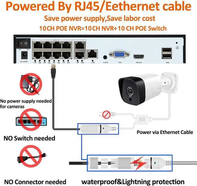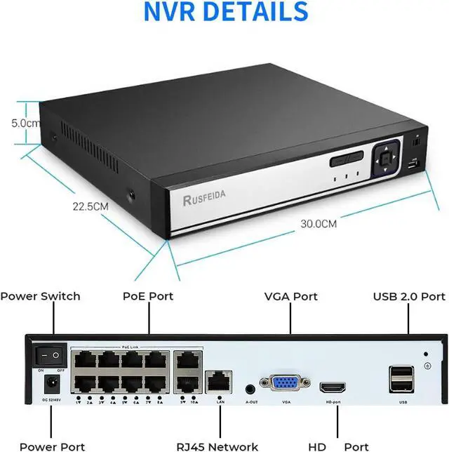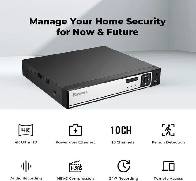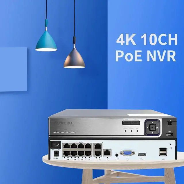 10CH 4K PoE NVR Surveillance Video Recorder. 4K(8MP)@3840x2160 Resolution, 10 Independent RJ-45 10/100 Mbps self-adaptive Ethernet interface, PoE with only one Ethernet cable (up to 330ft) for RUSFEIDA PoE Cameras to transmit both power and data, plug & play. Support 4K/8MP/5MP/4MP/3MP/1080p PoE Camera. Support up to 14TB HDD and ONVIF-Agreement.