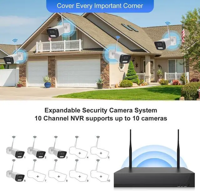Independent and Comprehensive Security Camera System Outdoor: Experience seamless video recording, playback, and storage directly onto an 10-Channel HD NVR, pre-installed with a 1TB hard disk. The system defaults to 24/7 recording, but allows users to customize their recording schedules for added convenience. Never miss a critical moment with this wireless security camera system.