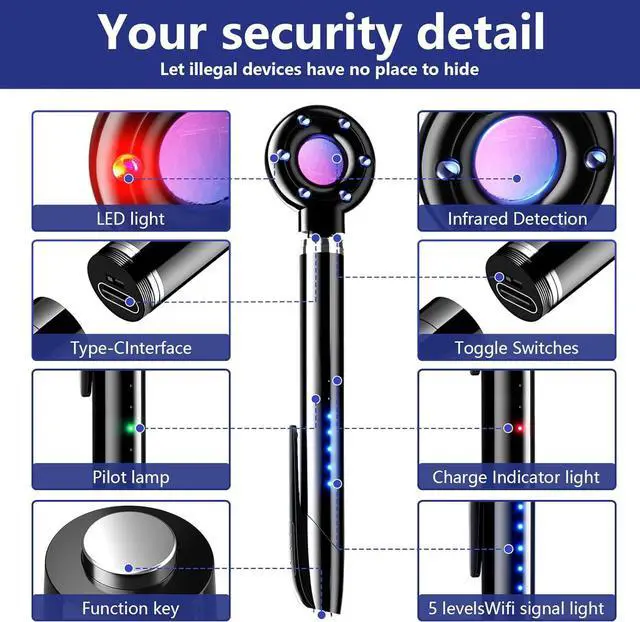 5 Sensitivity of Camera Detector Spy Camera FinderThis spy camera detector pen has adjustable 5 sensitivities to detect 1 MHz - 6.5 GHz RF signals in the range of 2 inches - 26.25 feet,also detects VHF/UHF transmitters, GSM/3G/4G bugs, GSM/3G/4G GPS trackers and various hidden devices.