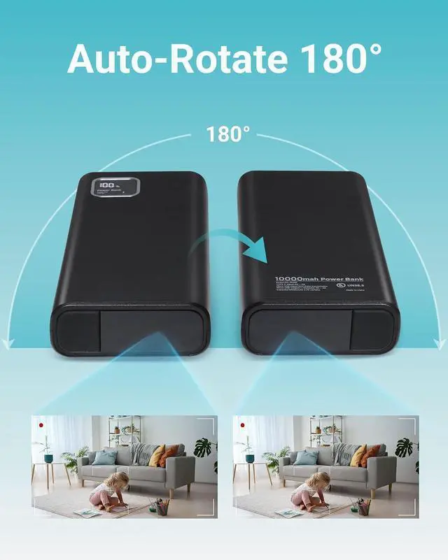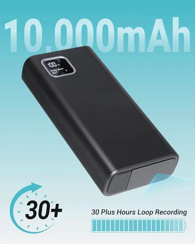 10,000mAh Power Bank & Security Camera Combined: This innovative device merges a high-capacity 10,000mAh power bank with a fully functional security camera. Charge your devices on the go and enjoy 24/7 wire-free surveillance, all in one convenient package. The built-in LED display shows real-time power levels with 1% precision, so youre always in the know.