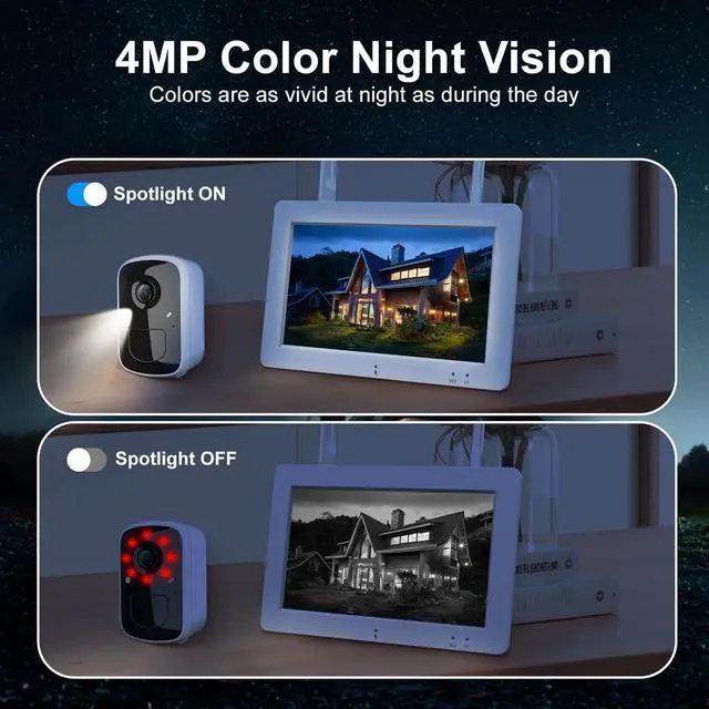 100% Wireless & Forever Solar-Powered: The wireless security camera system with monitor ensures 365 days of self-sustaining operation, and 3 hours of direct sunlight per day is enough to continuously power the camera. The efficient and environmentally friendly solar panels and the camera's built-in rechargeable battery make installation easier. You no longer need cumbersome wiring, nor do you need to pay extra electricity and installation fees.