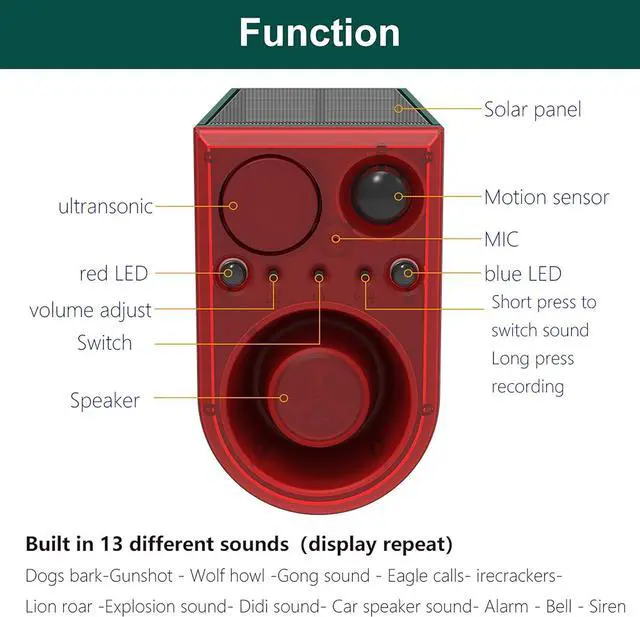 13 integrated sounds and recording function: You can choose from 13 integrated sounds or record your own. When recording from a phone, keep a distance of 0.4 to 1.9 inches from the solar motion alarm sensor to avoid degrading the recording quality.