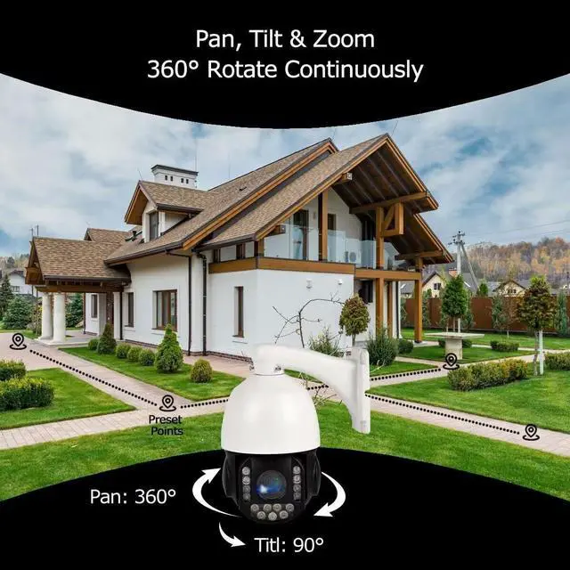 8MP HD & 25X Optical Zoom: this 8MP PTZ outdoor PoE dome camera ouputs ultra-high clarity HD video at 3840*2160@20fps, capture every detail with precision , With 5.3~130mm Auto Iris motorized lens, it allows 25X optical zoom without impairing image quality. It supports viewing the car license plate remotely, great for use in large places such as parking lots, hypermarkets, gardens, roadsides, etc. With pan from 0° to 360°,tilt -5° to 90°, the poe ptz outdoor camera allows 360 degree monitoring without dead angle. Srtong preset functions such as Call preset 105 to cancel tour mode, preset fucntions list is in the manual.
