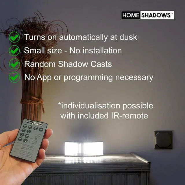 [Intruder deterrent]: More than a static light, as it simulates direct presence with moving shadows. Note: Casted shadows are not like perfect silhouettes of people as this is not necessary to make your home look more lived-in. Have a look at the videos to see shadow effects...