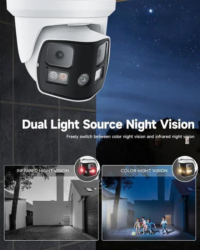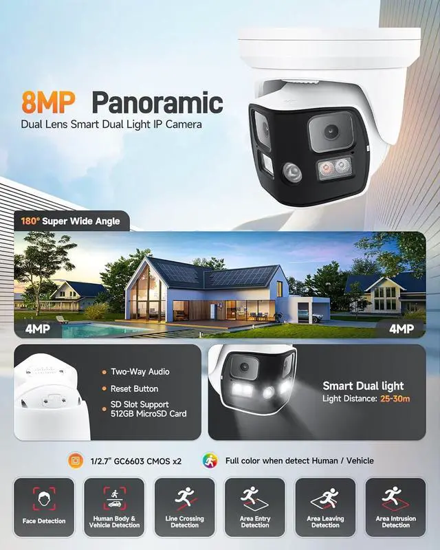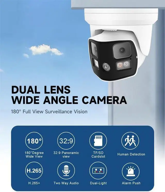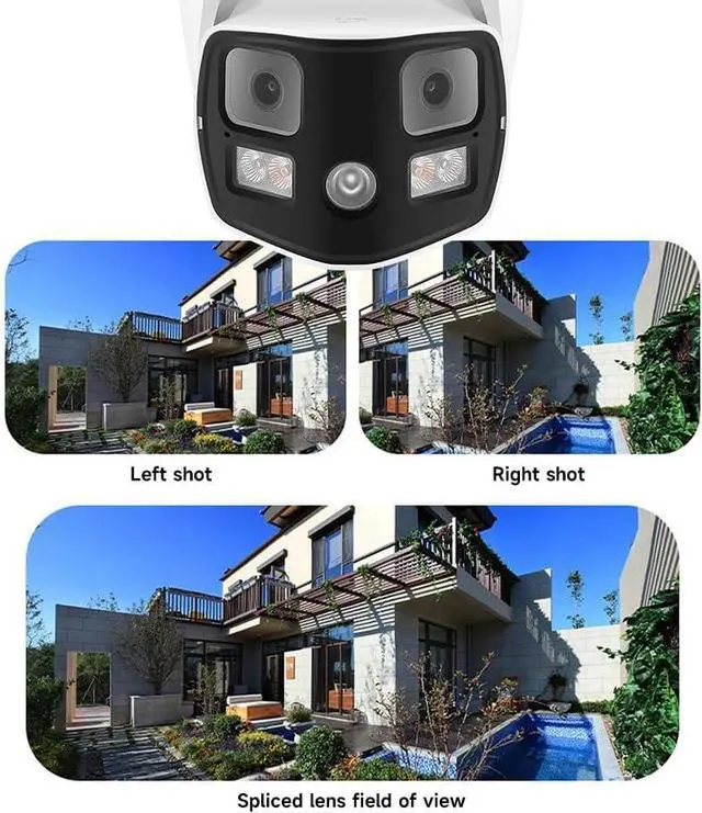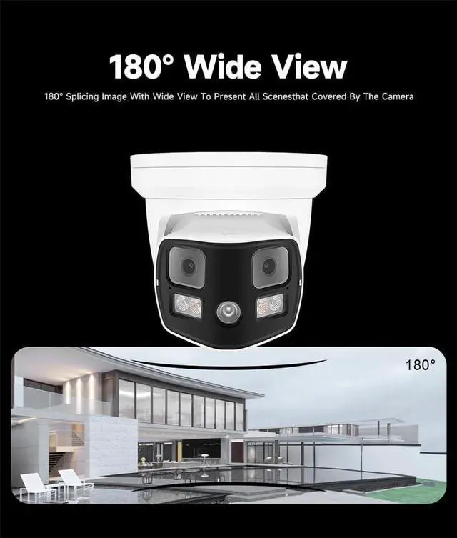 Wide-Angle Panoramic Security Camera: This 8MP 4K panoramic security camera features dual 1/2.9" progressive scan CMOS sensors and two fixed 4mm F1.6 lenses, delivering an ultra-wide view. Ideal for monitoring scenes with at least 3 meters of distance to ensure clear, high-resolution images. For smaller or closer scenes, the dual-lens setup may result in noticeable split imagery, potentially affecting monitoring quality.