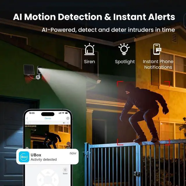 AI Motion Detection & Timely Warning: When the professional PIR sensor detects motion, the security camera outdoor quickly emits a spotlight or sounds the siren to intimidate intruders. While an instant phone notification is pushed, which lets you always be in the know.