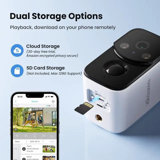 Secure Your Video on Dual Storage: Upload motion recordings to encrypted cloud storage or save to local SD card storage (not included), and easily playback/download on your phone even the outdoor security camera is damaged or lost.