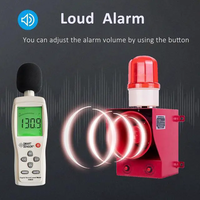 Adjustable volume tone siren: Alarm with push-button design for adjusting the sound and switching the built-in tones (12 built-in tones). The alarm systerm has a USB port for uploading your own audio