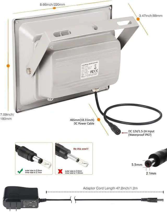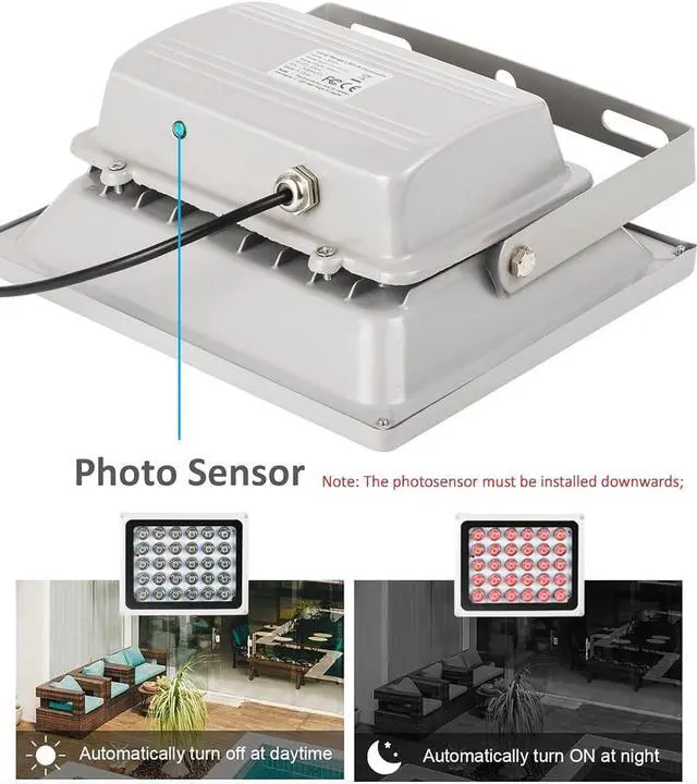 FULL SET ACCESSORIES--The package includes IR light, 12V/2A adapter, installing screws and user manual, please install the light with sensor head down to avoid sun exposure.