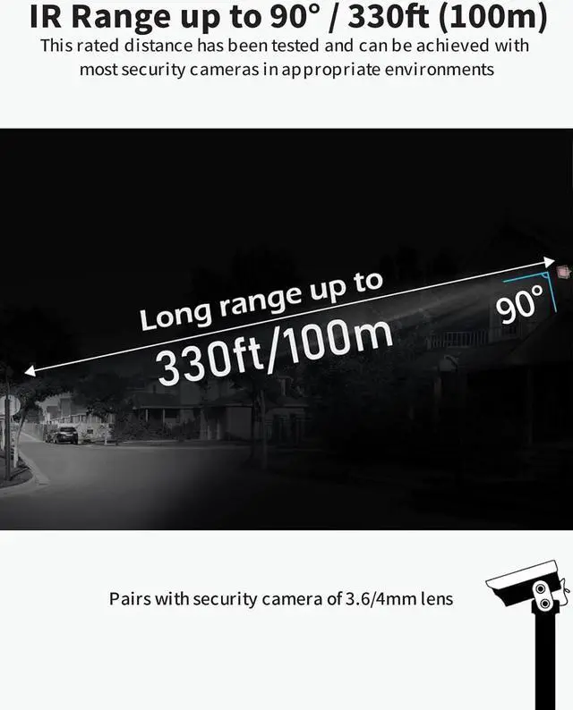 Up to 330ft/100m Night Vision--850nm infrared wavelength, the red glow will be emitted at night. It has a longer range than visible light due to the higher wavelength. Super Long Range up to 330ft/100m for CCTV cameras night vision distance!