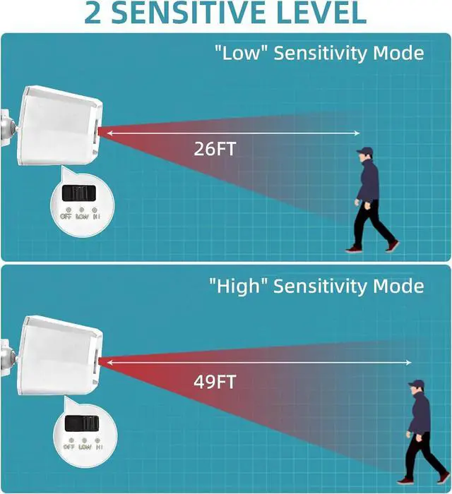 LONG RANGE WIRELESS MOTION SENSOR ALARM: Transmission ranges up to 3280ft/1000m from each sensor to the receiver; The range of driveway alert wireless outside is 26FT-49FT, which means Cars, people, animals and other motion objective can be detected within 49ft/15m of each sensors angled eye.