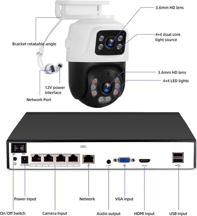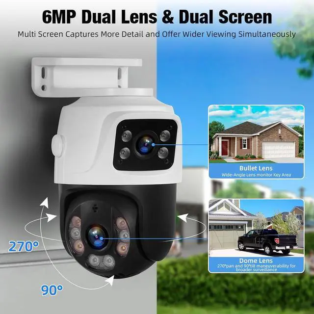 PoE Dual Lens Security Camera 1 fixed camera and 1 PT camera make sure take care any angle for review. When the pt camera tracking the motion, the fixed camera will stay still for more general view.One camera is all you require, making it a cost-effective choice for surveillance. 2 separate view, won't missing any details. IP66 weatherproof camera used high quality ABS materials, it is resistant to vandalism and can withstand the harshest outdoor conditions.