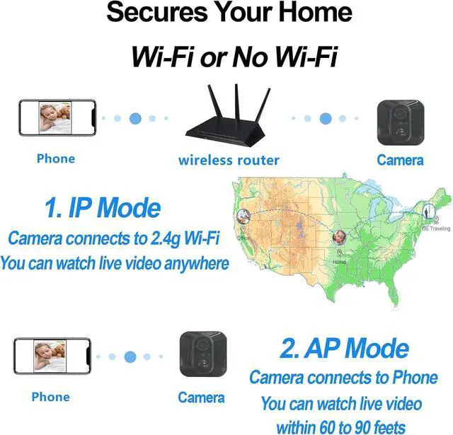 No Wi-Fi Needed Wireless Security Cameras : You can build an AP hotspot security camera system in off-grid area. You can watch clear live video on mobile app after the wireless camera indoor's Hotspot was connected to your phone.