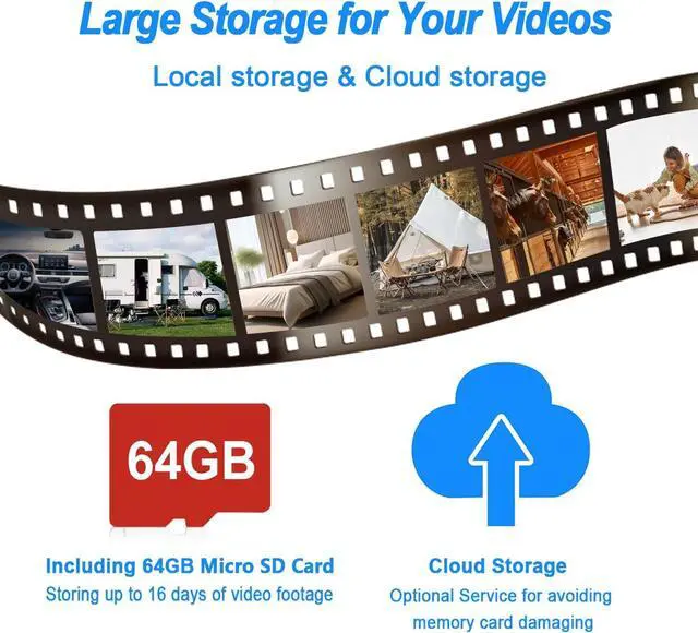 Flexible Storage Options : Store footage locally on the included 64GB SD card or securely in the cloud for convenient access and backup.