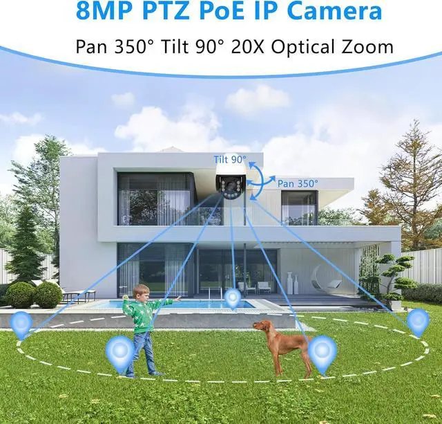 Ultra 8MP HD & Pan Tilt 20x Optical Zoom 8 megapixel PoE PTZ dome IP camera, 1/2.8" progressive scan CMOS, support max. 3840x2160 @20fps smoothy image quality, Pan 0° ~ 360°, Tilt -5° ~ 90°, maximally monitor your property security from all corners. 20X optical zoom is easy to view distant objects details without affecting the image quality. Not Compatible with Reolink/ Lorex/ Amcrest NVR!