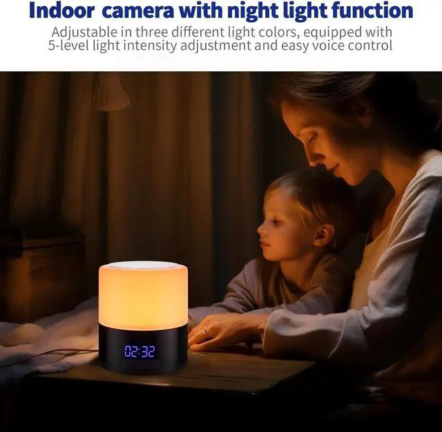 SMART BLUETOOTH SPEAKER & NIGHT LIGHT FUNCTIONMore than just a WiFi camera, this multifunctional device includes a high-quality Bluetooth speaker and 5 adjustable night light colors. It creates a cozy atmosphere, perfect for relaxation, gatherings, or daily ambiance enhancement