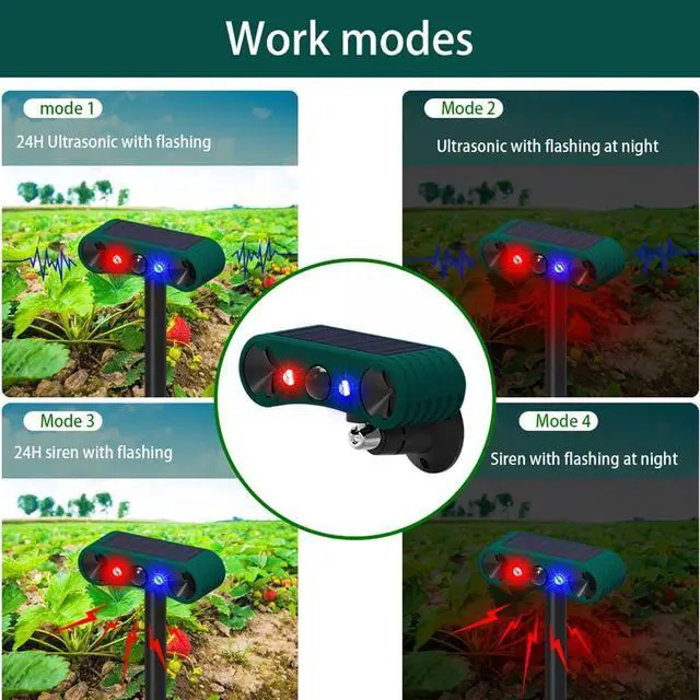 4 Modes The solar motion detection siren has 4 different modes that you can set according to your needs: Mode 1: 24-hour ultrasonic flashing; Mode 2: Ultrasonic flickering at night; Mode 3: 24-hour alarm flashing; Mode 4: Alarm flashes at night. You can choose between 24-hour mode or 12-hour night mode, as well as ultrasound mode or alarm mode