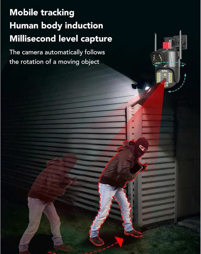 1080P Intelligent Full Color Night Vision- The outdoor dual lens security camera supports intelligent night, infrared night, and full color night. Quality infrared LEDs & Sensor extend the range of night vision reach up to 33 ft, lets you see everything clearly even in the dark. It can also present color images without lighting at night, and can be controlled by the mobile app software at will.