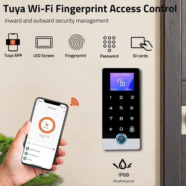 Multiple Users, Multiple Access Ways10000 users capacity. Fingerprint, swipe card or code password or TUYA APP multiple unlocking methods to open the door. Keypad come with 5PCS ID keyfobs, compatible with all electric locks. with LED screen and smart phone APP wireless control keypad, your finger is the key, management users, more convenient and quick.