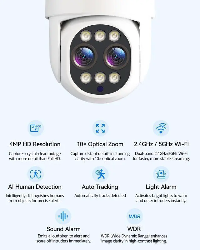 10x Optical Zoom with 4MP High-Definition Clarity: Each camera delivers ultra-clear 4MP video and features a 10x optical zoom lens for smooth, high-quality magnification. This allows you to clearly identify distant faces, license plates, and fine details while the dual-lens design simultaneously provides a wide-angle view for comprehensive monitoring