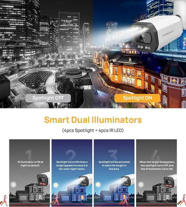 Smart Dual Light Full Color Camera: This 5mp full color poe camera equipped with intelligent dual lighting (built-in 4 warm lights and 4 infrared LEDs), can provides incomparable colorful video up to 98ft .Smart Dual Light technology adopts smart algorithm to detect targets. The IR illuminator is on at night when the target appears in the monitoring area, the white light is on, and the camera records the full-color video and information of key events. When the target is out of the monitoring area,the IR illuminator is on, which reduces light pollution efficiently.