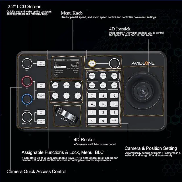 Precise and Efficient Parameter ControlAllows for quick adjustment of key camera settings, including exposure, shutter speed, iris, compensation, white balance, focus, and pan/tilt/zoom speed. Equipped with a professional joystick and a seesaw-style zoom control, ensuring smooth and accurate adjustments for optimal video capture.