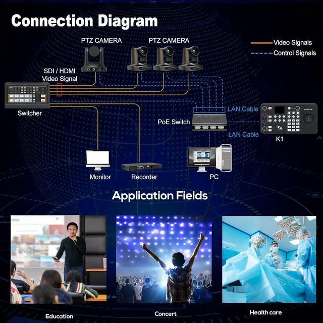 Wide Compatibility & Multi-Camera ControlSupports hybrid control across multiple protocols, including IP, RS-422, RS-485, and RS-232. Compatible with widely used control standards such as VISCA, VISCA-Over-IP, and Pelco P&D. Capable of managing up to 255 IP cameras within a single network, making it suitable for various monitoring and broadcasting setups.