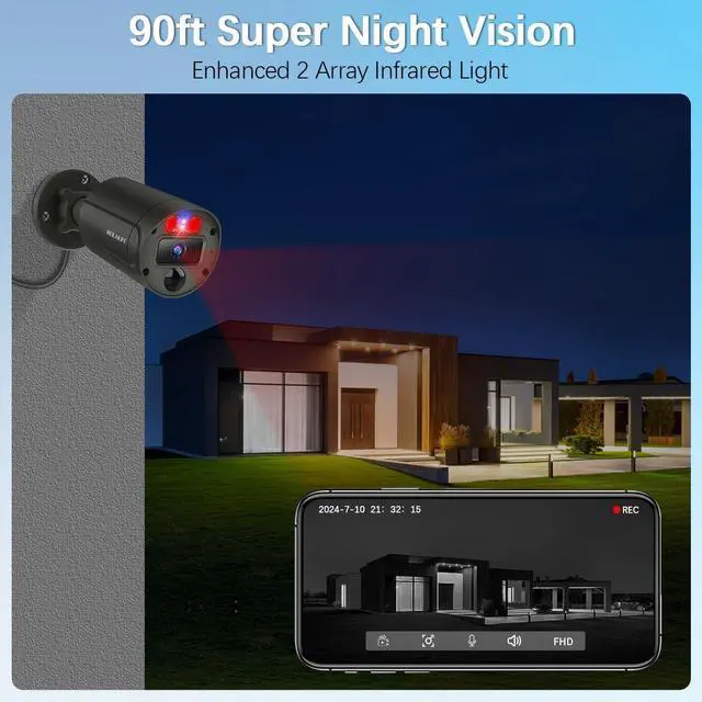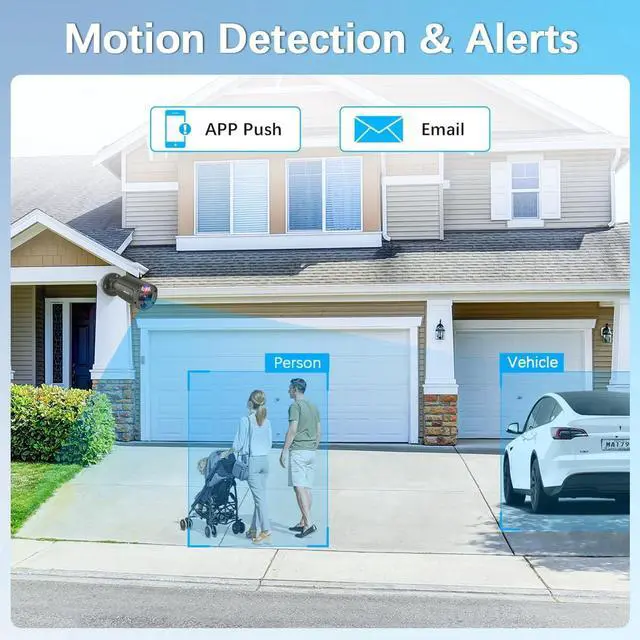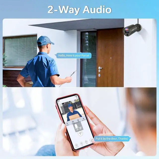 2-Way AudioThe 2-way audio security camera system is equipped with advanced noise-canceling microphones and speakers, ensuring clear and seamless communication between the app and the home security camera. This home video surveillance camera allows you to stay connected with your family while away, protecting your loved ones and property from potential threats.