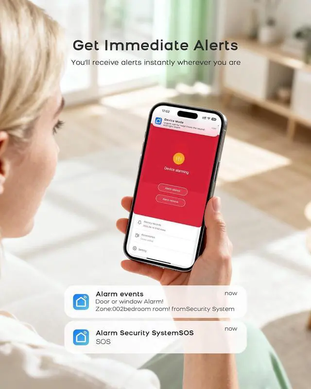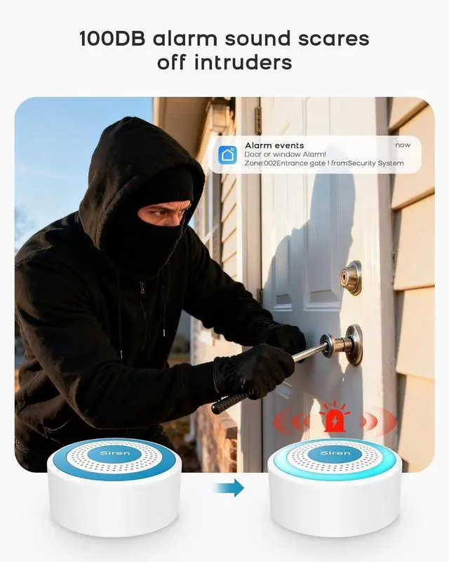 Instant Alerts & Loud Siren: When someone breaks into your home, an alarm will sound immediately and send real-time alerts directly to your phone.